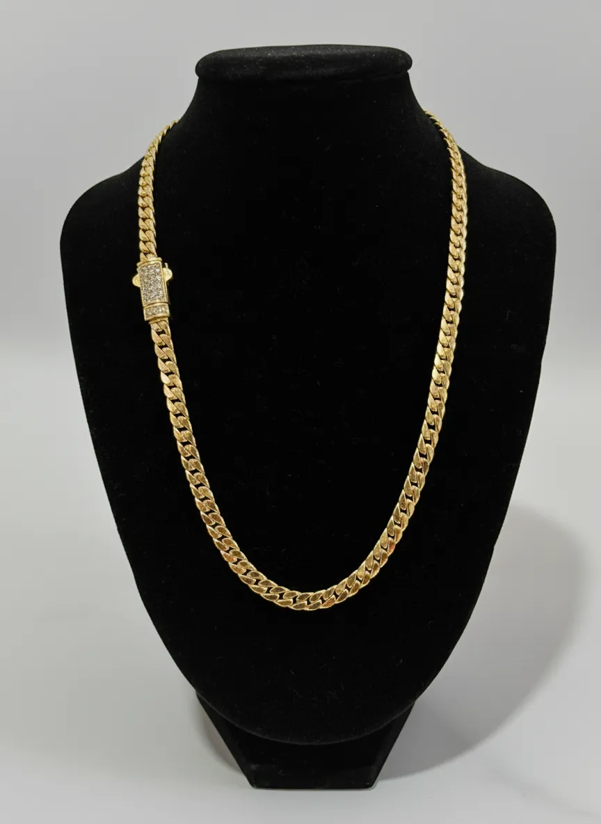 Con un peso de 13.2 gramos y un largo de 45 cm, esta cadena se adapta perfectamente al cuello, ofreciendo un ajuste cómodo y un brillo impecable que realza cualquier look, ya sea para uso diario o para ocasiones especiales.