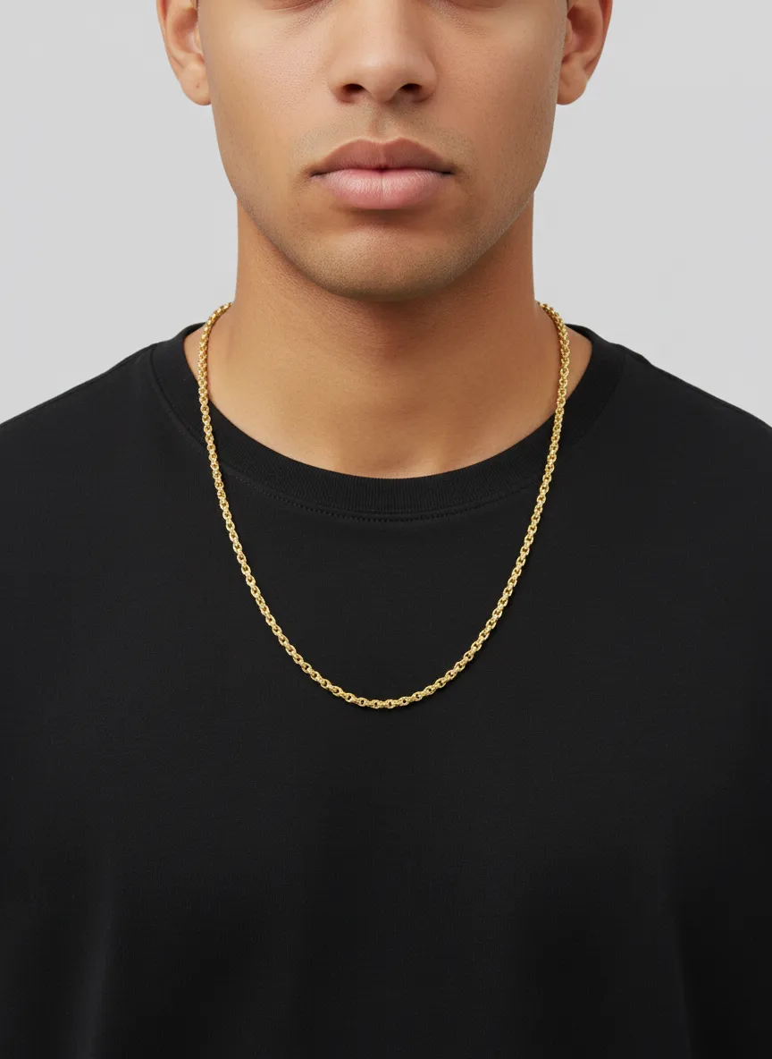 Cadena Rolo Chain en Oro 18K 750 de 7.69g y 60 cm. Una joya elegante, clásica y versátil, ideal para quienes buscan un diseño atemporal con brillo, presencia y sofisticación.