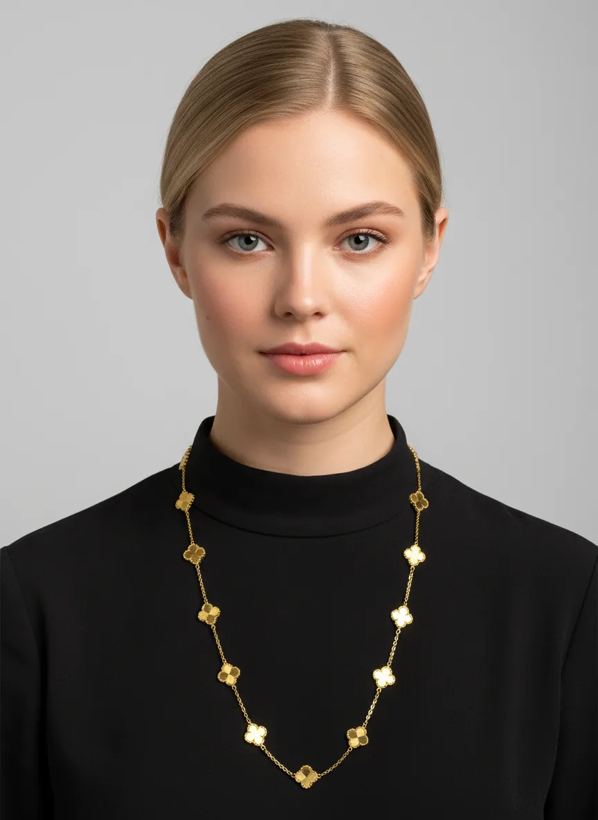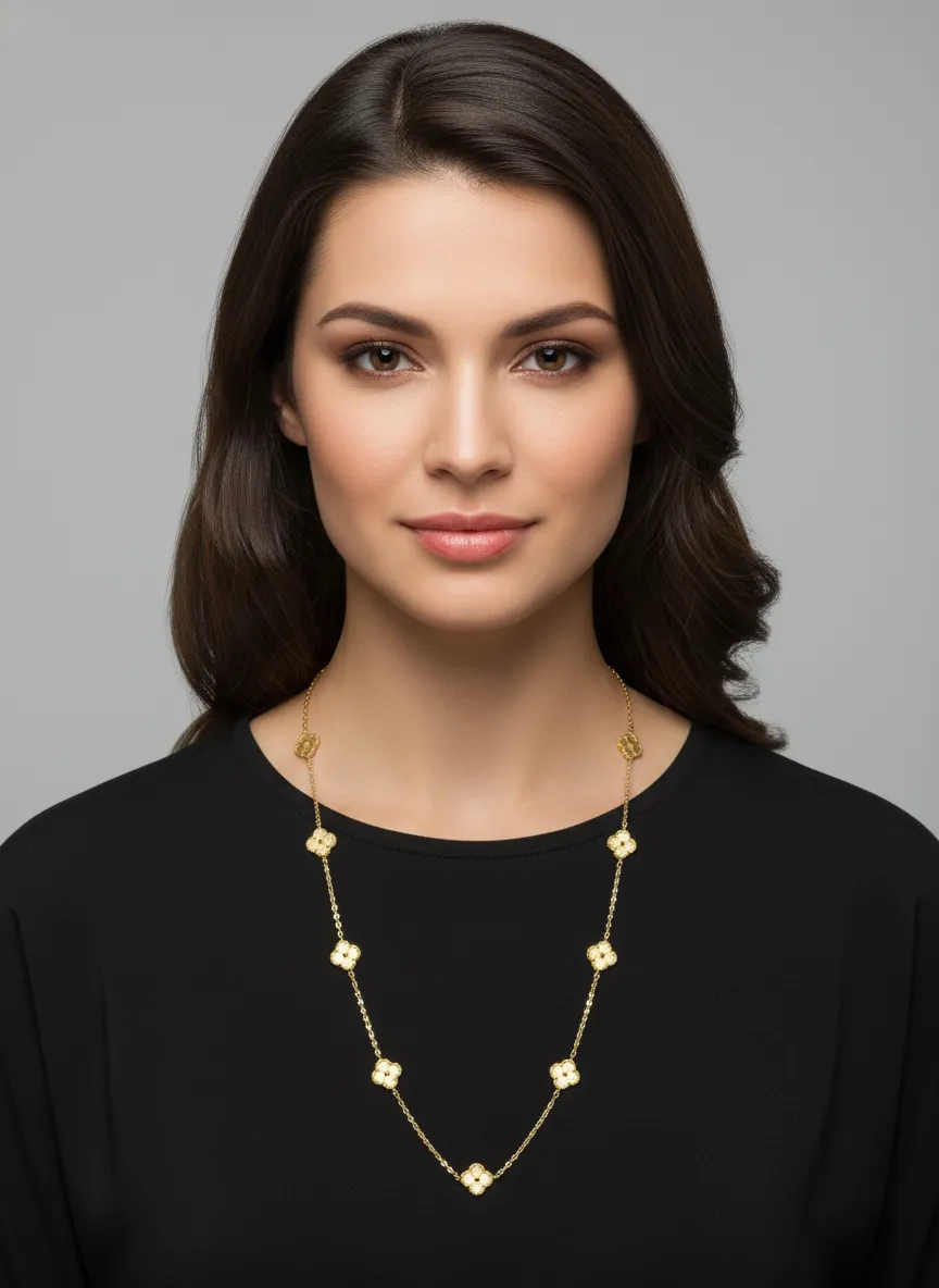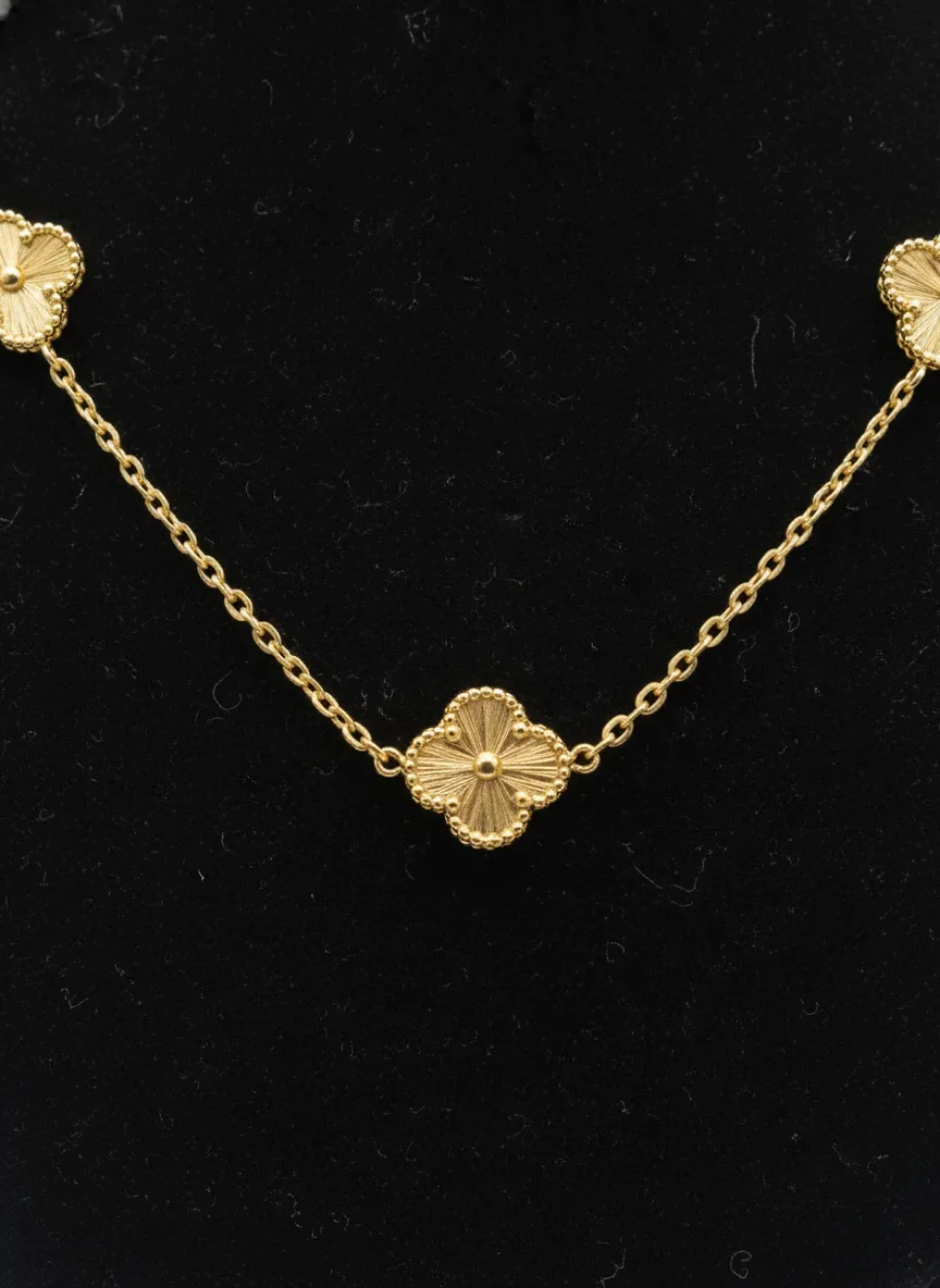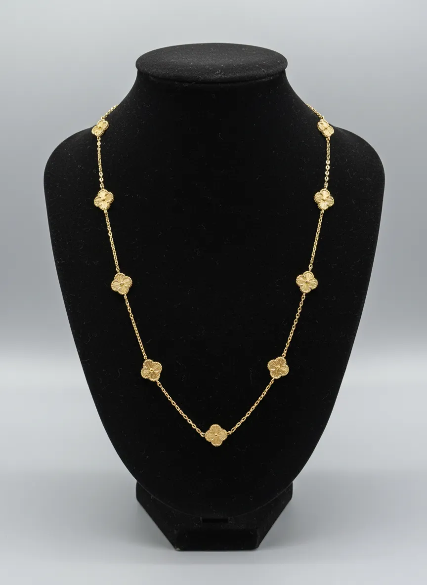 Fabricada en oro amarillo de 18 quilates (750), garantiza brillo duradero, resistencia y un acabado premium propio de la joyería fina. El diseño Station Necklace estilo Van Cleef es altamente valorado por su elegancia discreta, su inspiración de lujo y su capacidad de adaptarse tanto a ocasiones especiales como al uso diario con un aire sofisticado.